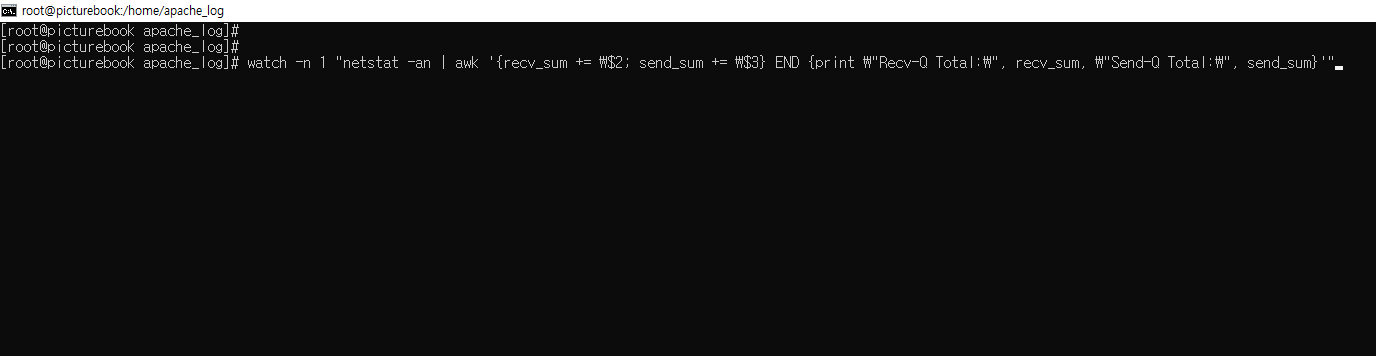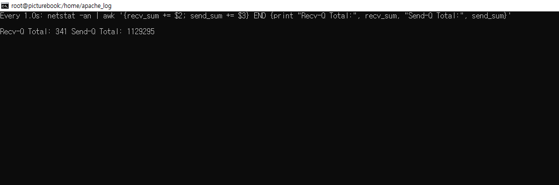 watch -n 1 "netstat -an | awk '{recv_sum += \$2; send_sum += \$3} END {print \"Recv-Q Total:\", recv_sum, \"Send-Q Total:\", send_sum}'"