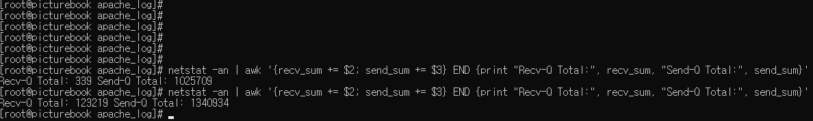netstat -an | awk '{recv_sum += $2; send_sum += $3} END {print "Recv-Q Total:", recv_sum, "Send-Q Total:", send_sum}'